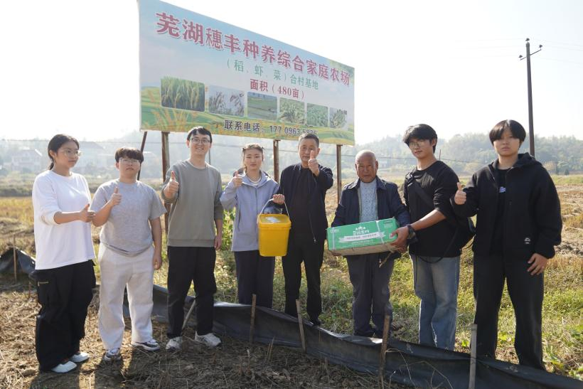 在农业技术服务活动中,师生们深入田间地头,园林园艺学院许辉博士与芜湖禾泽生态农业有限公司总经理周华共同为涉农专业学生开展了一节田间课程,结合“稻田养虾”生产实践,讲解种养技术要点,探讨绿色农业的发展路径。活动后,师生们还向农业企业和当地农户捐赠了肥料、生物制剂等农业生产物资。