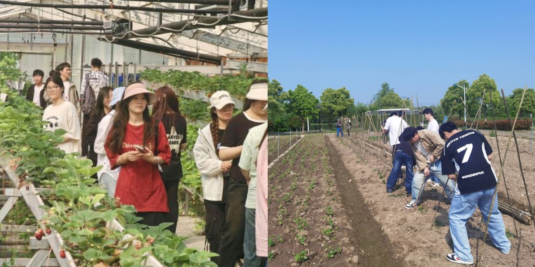 随后,吴龙生和王恺老师分别带领学生到智能温室和蔬菜种植基地开展教学活动。活动中,吴龙生老师向学生介绍了智能温室设施运转及草莓生产情况,并详细讲解了设施园艺生产过程中注意事项,尤其注意温室内温度、湿度及水费的把控,之后带领学生对智能温室进行了清理工作,为下一次蔬菜种植提前做好准备工作。王恺老师向学生介绍了基地中黄瓜、茄子、西红柿等种植与养护过程中注意事项,并以身示范带领学生为黄瓜苗搭建攀援架。在活动中,同学们团结一心,通力合作,高效完成了实训任务,不仅得到了锻炼,收获了知识,更增强了专业自信,他们纷纷表示回到学校要加强专业知识学习,增强技术技能,为我国现代农业发展贡献青春力量。