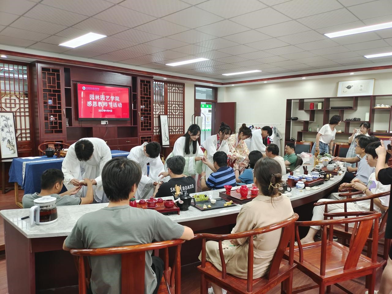 9月9日,园林园艺学院开展“一盏清茗传师恩”活动,中华茶艺爱好者协会为老师们展示了茶艺表演,并为老师们敬奉一杯茶,表达来自学生们浓浓的谢意与感激。