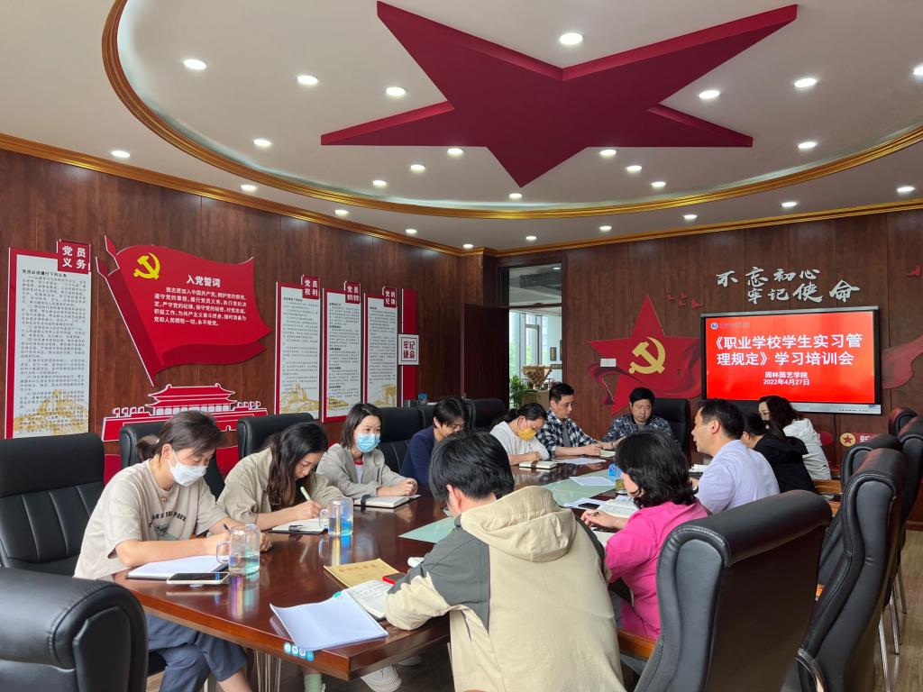为贯彻落实教育部等八部门关于印发《职业学校学生实习管理规定》,进一步规范和加强学院学生实习管理工作,根据学校要求,2022年4月27日上午,园林园艺学院所有教师参加了实习管理平台线上培训会,认真学习《职业学校学生实习管理规定》文件精神。