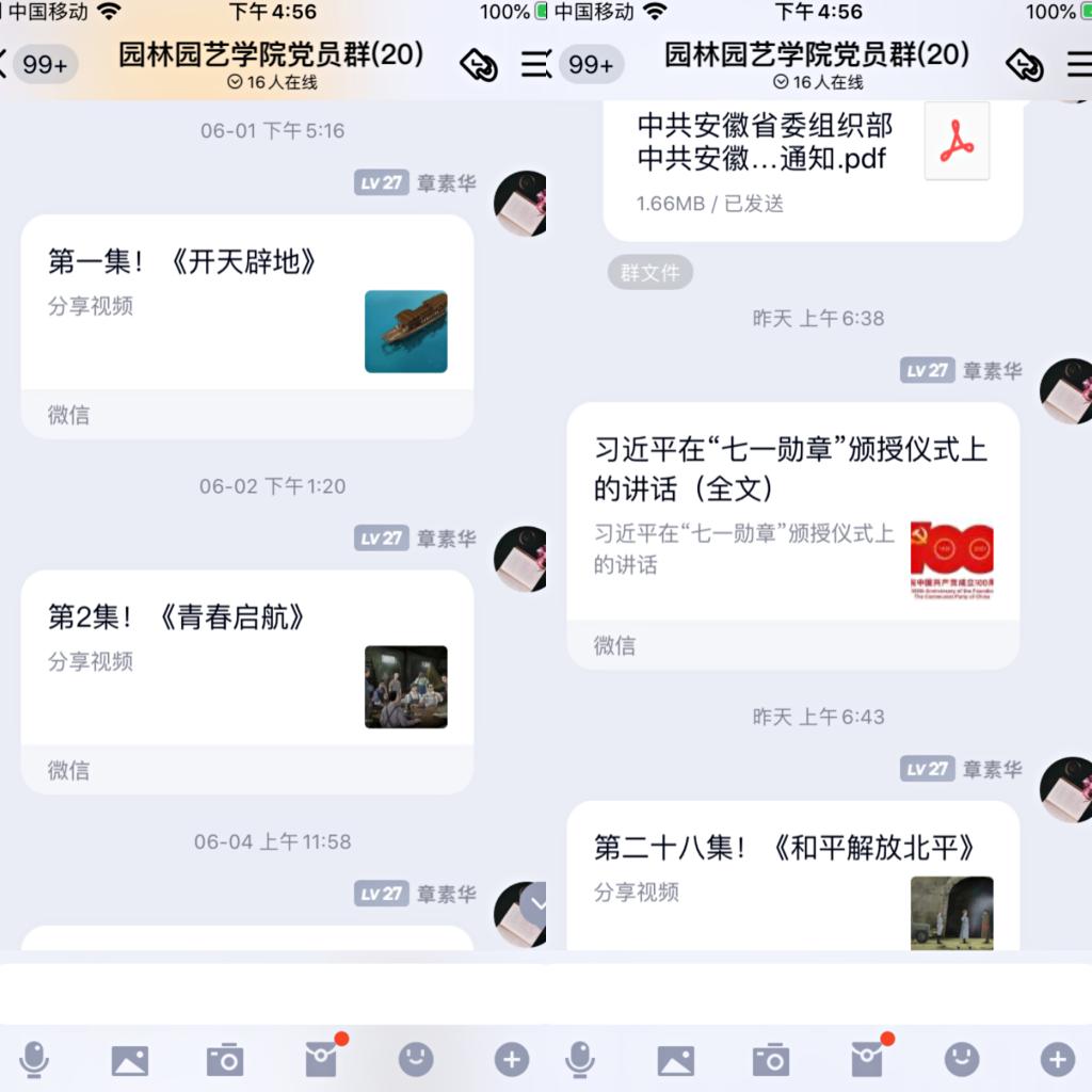 学院党总支在制定学习计划安排会议上,党总支书记杨宁要求全体党员在集体领学的基础上,加强自学,认真学习《论中国共产党历史》《中国共产党简史》……从全方位、多角度深入认识党的历史发展和丰功伟绩,要了解党、更爱党,要认清从哪儿来、到哪儿去,要深刻体会、用心思考、入眼入耳、入脑入心,深刻认识红色政权来之不易,新中国来之不易,中国特色社会主义来之不易,牢记党的初心和使命,结合新时代安徽发展的成就,不断增强信仰、信念、信心。要求全体党员结合党史专题学习和自身工作实际,认真撰写心得体会。学院党总支副书记章素华对专题一和专题四的内容进行了领学,同时,在学院党员教师群中分享了《开天辟地》《青春起航》《安源大罢工》《三湾改编》等十几个党史学习小视频,深入学习贯彻习近平总书记有关党史学习教育的重要讲话精神。