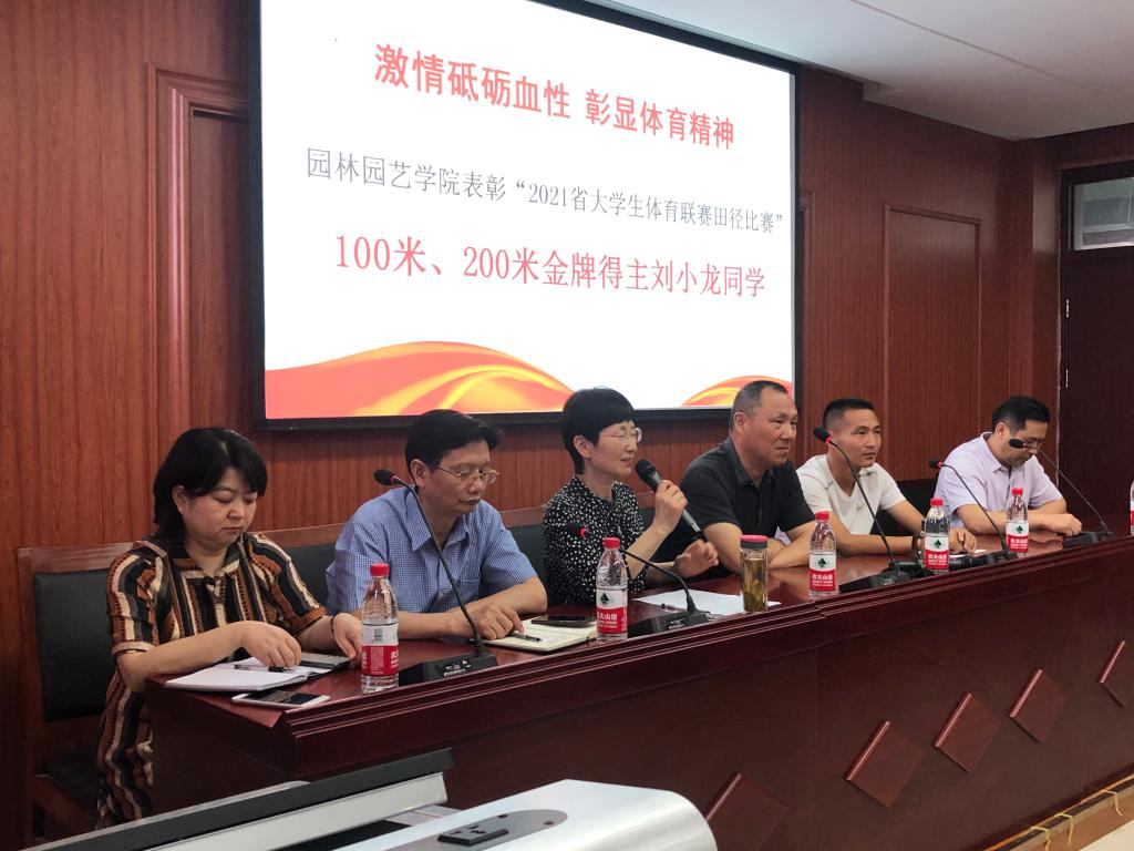 6月4日上午,园林园艺学院在精实楼二楼多功能报告厅举办了“2021年省大学生体育联赛田径比赛”100米、200米金牌得主刘小龙同学表彰大会。参加会议的有校体委副主任、学校体育教学部主任宦集体;校高水平田径俱乐部总教练员、体育教学部老师潘云磊;园林园艺学院党政领导班子,全体辅导员和近百名学生代表。会议由学院党总支副书记章素华主持。