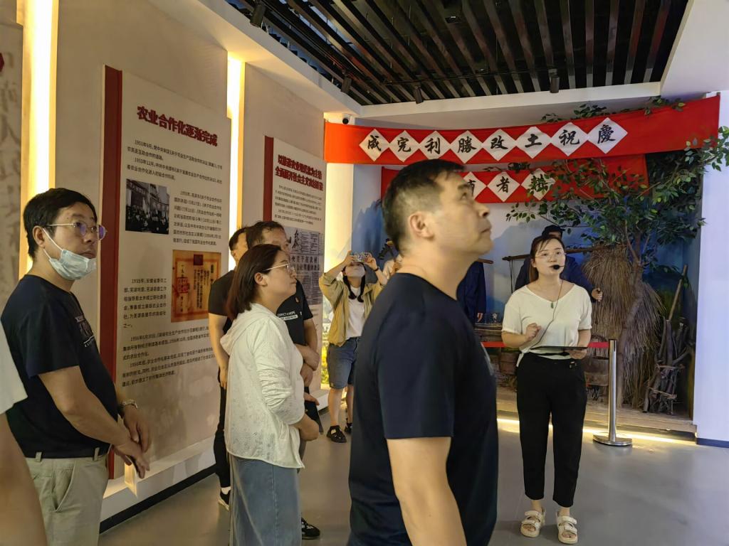 在芜湖市党员教育培训基地(农村)——芜湖市农村党建馆,党员教师深刻感受到乡村振兴中党建引领的作用。整个展馆面积约720平方米,以“党建引领乡村振兴”为主线,内设有百年乡村社会变化史、农村党建工作方法、市县区特色做法、党性教育区四大展厅,同时建有数字乡村展示室、桃园书房、智慧党建平台等互动体验区。党建馆通过主题内容不断变换的展示形式,运用艺术浮雕、场景还原、声光电、360°全息等高科技多元化陈展手段,为各位党员老师带来视、听、触全方位互动体验式。尤其是入馆大屏不间断播放全市农村基层党建工作宣传片,配以“在希望的田野上”欢快的音乐,展现一幅幅美好新农村的图片,吸引了很多党员教师观看,甚至跟着哼唱。