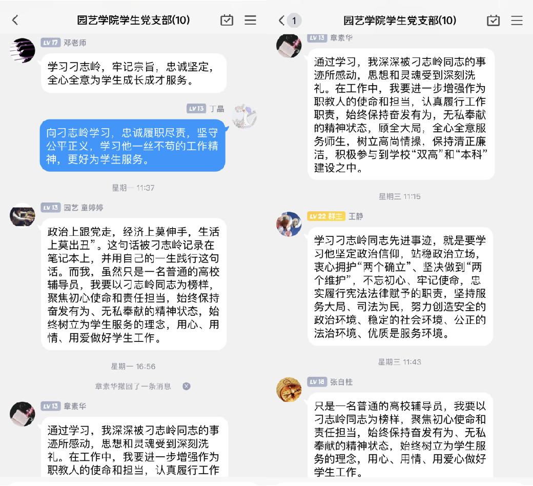 会后,支部党员纷纷发表了心得体会。章素华表示:“通过学习,我深深被刁志岭同志的事迹所感动,思想和灵魂受到深刻洗礼。在工作中,我要进一步增强作为职教人的使命和担当,认真履行工作职责,始终保持奋发有为,无私奉献的精神状态,顾全大局,全心全意服务师生,树立高尚情操,保持清正廉洁,积极参与到学校‘双高’和‘本科’建设之中。”王静说到:“学习刁志岭同志先进事迹,就是要学习他坚定政治信仰,站稳政治立场,衷心拥护‘两个确立’、坚决做到‘两个维护’,不忘初心、牢记使命,忠实履行宪法法律赋予的职责,坚持服务大局、司法为民,努力创造安全的政治环境、稳定的社会环境、公正的法治环境、优质是服务环境。”