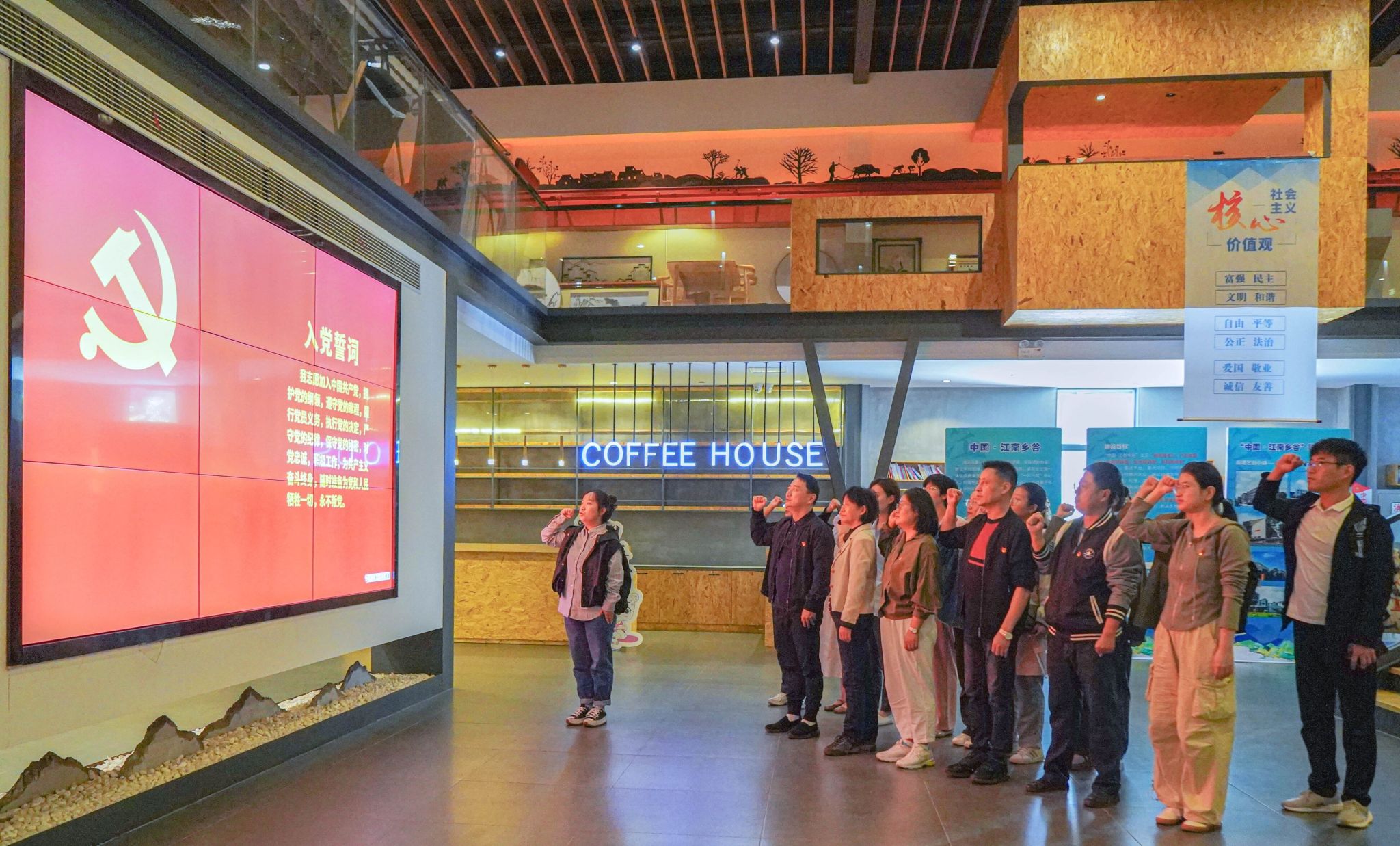 “我志愿加入中国共产党,拥护党的纲领,遵守党的章程,履行党员义务……”在学生支部书记王静的带领下,园林园艺学院全体党员重温了入党誓词,洪亮的宣誓声铿锵有力、振奋人心,每一位党员胸前的党员徽章熠熠生辉。在党建引领乡村振兴、助力特色小镇建设的艺创会客厅,活动拉开了序幕。