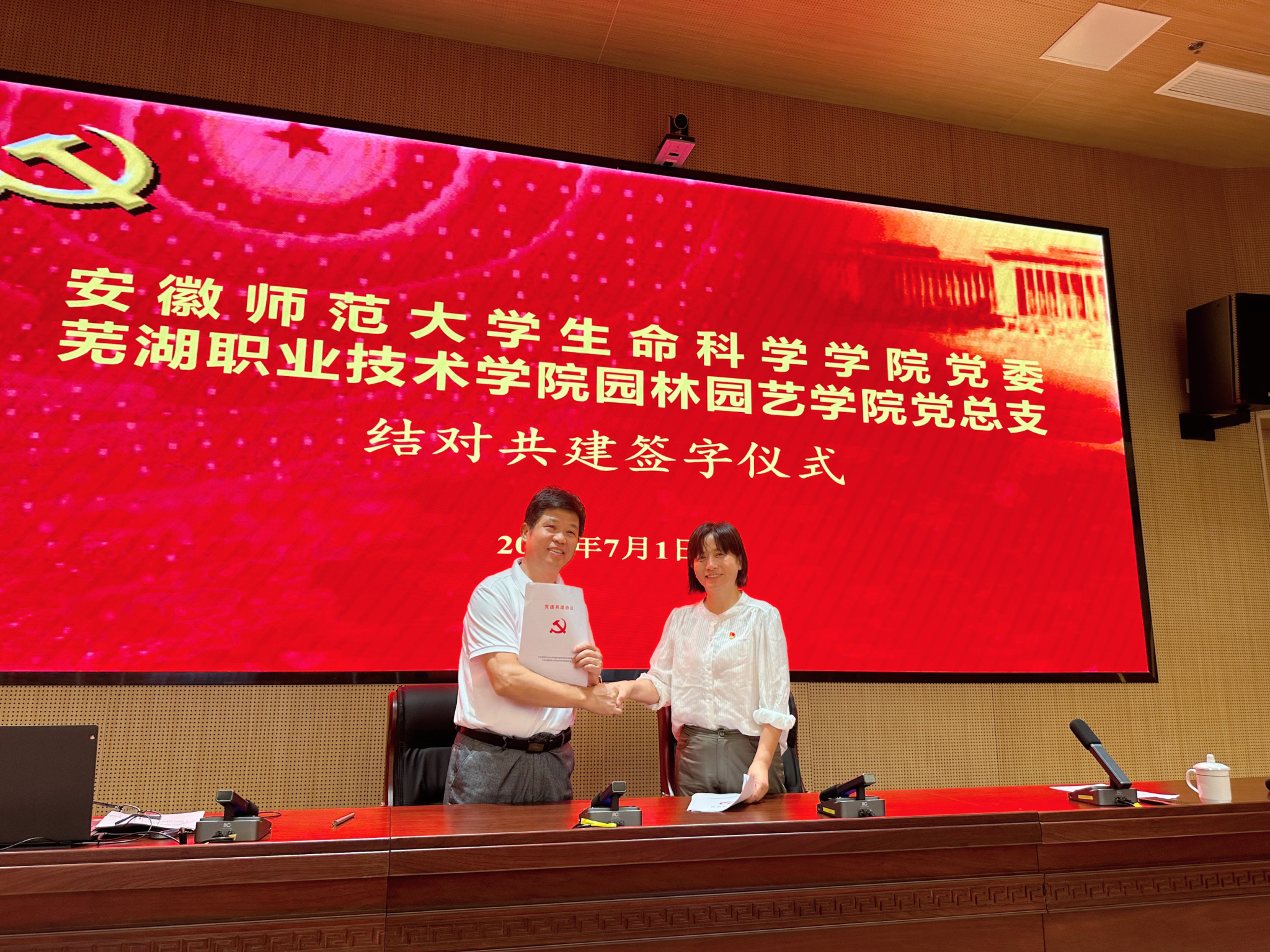 签约仪式上,章素华重点介绍了园林园艺学院建设的基本情况和园林园艺学院党总支的党建特色,指出学院坚持立德树人根本任务,“围绕党建促发展,抓好发展促党建”理念,以专业优势服务乡村振兴。安徽师范大学生命科学学院党委副书记汪倩倩介绍了安徽师范大学生命科学学院的发展历程和党建特色,以及下一步校地共建合作的主要设想。双方负责人共同签署了协议书,并就基层组织建设、人才培养等方面进行了深入交流和讨论。双方表示,将以此次结对共建为契机,充分发挥各自的资源优势,创新开展基层党建活动,在教学科研、社会实践、服务社会和服务乡村振兴等方面全面开展合作交流,共同提升基层党建工作质量,以党建引领业务,以党建推动教育教学工作。