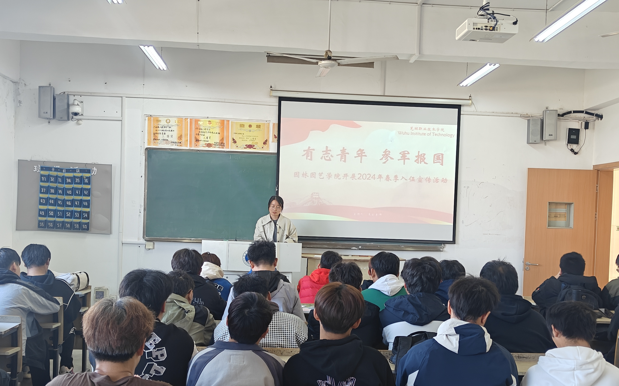 为积极响应国家号召,深入学习贯彻习近平强军思想,进一步提高学生的爱国情怀,2023年11月17日下午,园林园艺学院组织开展了2024年春季应征入伍宣传活动,50余名有志青年参加了宣讲会,会议由辅导员老师王云主持。