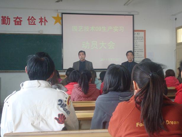 为保证实习任务的顺利完成,园林园艺系与合作企业进行了积极的准备,共同周密部署和精心组织安排。3月4日和3月11日下午,园林园艺系分别召开了园林工程技术09-1.2班和园艺技术09-1.2班生产实习动员大会,系领导、各教研室主任、生产实习指导教师、班主任参加了动员大会。会上,黄主任就本次生产实习工作作了统一部署与动员,强调了生产实习的目的和意义。他说,生产实习是使教学与生产实际更紧密结合,也是学生向工作在生产第一线技术人员学习的最佳场所,是锻炼自己的极好机会;在实习过程中,能够将课堂上学到的理论知识和技能在岗位实践中得到充分应用,增强自身的动手能力,还能体验工作、生活的艰辛和乐趣。希望同学们通过生产实习,巩固和拓宽所学理论和专业知识,提高实践能力及分析问题和解决实际问题的能力,进一步培养敬业精神、团结合作意识,增强组织纪律性,为后续课程教学、毕业顶岗实习及毕业后迅速适应职业岗位要求创造条件。最后他预祝本次生产实习取得圆满成功。随后,各个实习点的指导老师分别向各实习点的同学们介绍了实习内容和注意事项,并落实了出发前的各项准备工作。动员大会激发了同学们的学习热情和主动性,同学们情绪高昂,表示要珍惜生产实习机会。