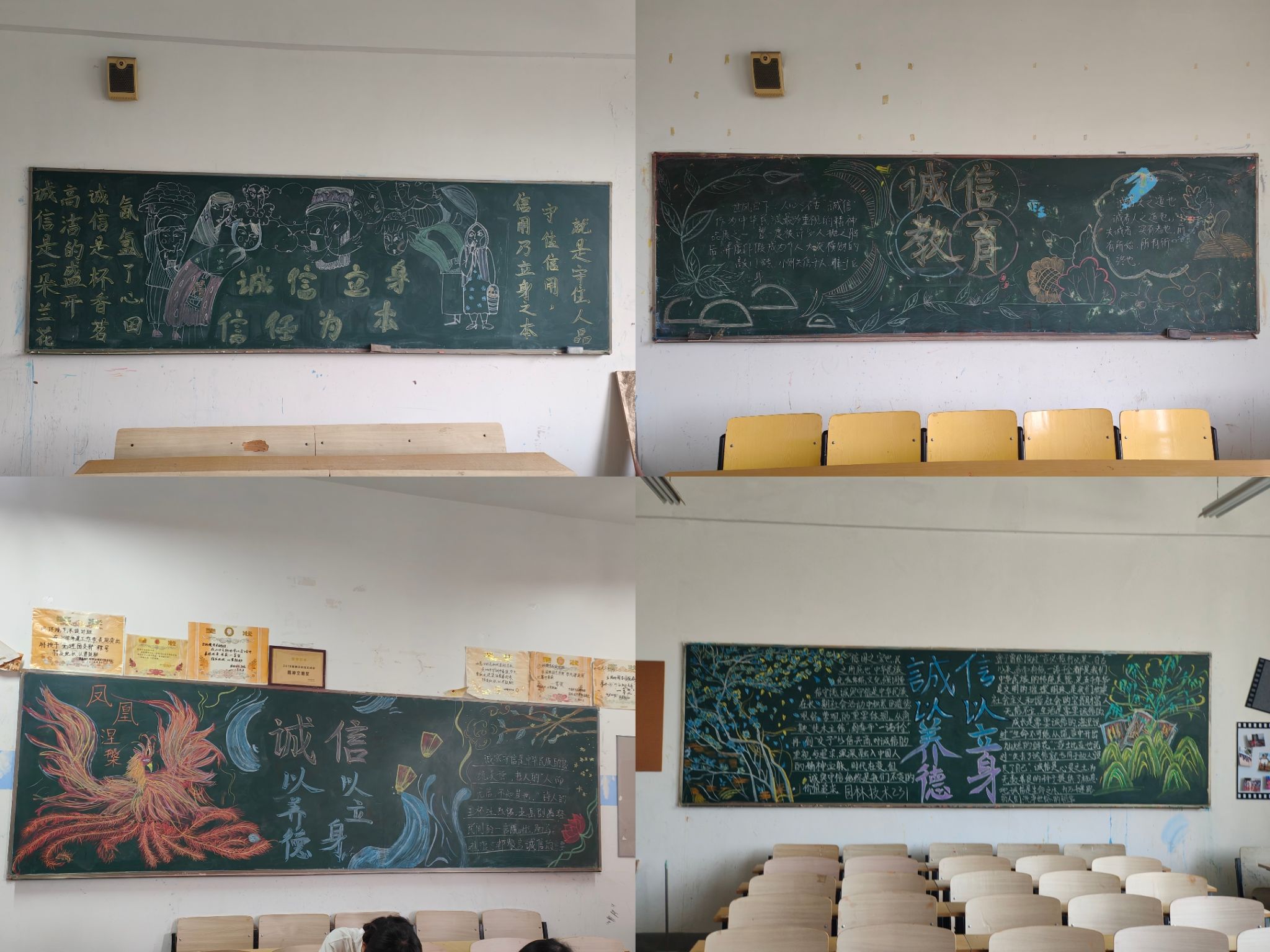 学院各班级还围绕资助诚信教育主题精心策划黑板报,有的以新颖的版面设计,鲜明的色彩以及生动的文字体现诚信主题思想,有的引用古训来体现诚信的重要性,黑板上的一笔一划,无不展示了同学们诚实守信的坚定信念。