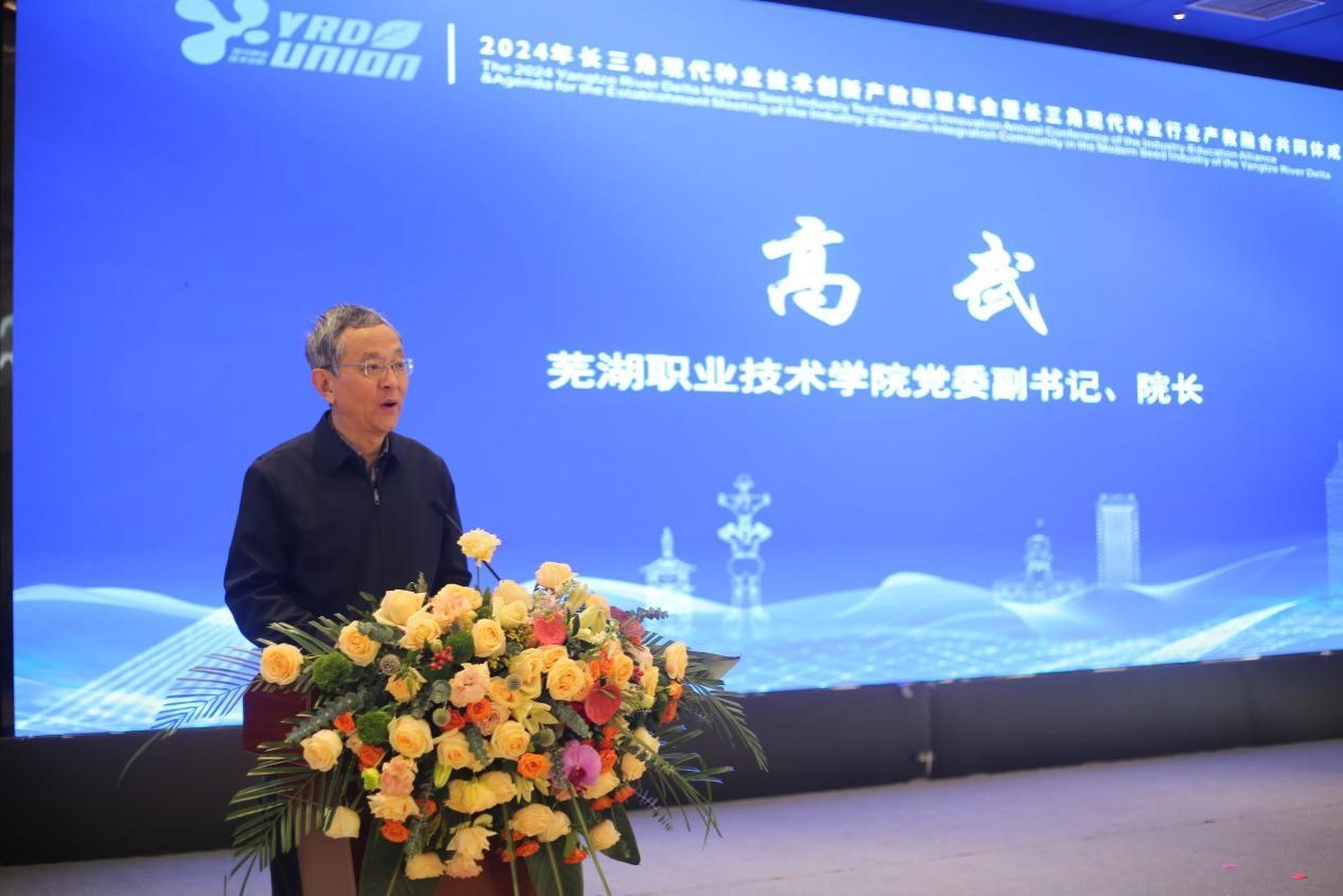 高武在致辞中首先对参加会议的联盟单位表示热烈欢迎,他表示,长三角现代种业技术创新产教联盟作为促进教育链、人才链与产业链、创新链有机衔接的平台,一直致力于加快构建“产学研相结合,育繁推一体化”的现代种业体系,作为全国首批“示范校”、“优质校”、“双高校”,芜湖职业技术学院始终聚焦乡村振兴国家战略,扎根“三农”沃土,勇担强农兴农使命,通过“课堂移村口、师生到田头、成果进农户、论文写大地”,融区域、接地气、出实招、见实效,形成鲜明的办学特色,为全面推进乡村振兴、加快农业农村现代化提供科技支撑和人才保障。希望联盟单位能“攥指成拳”,抱团发展,聚焦种业领域关键核心技术,开展深入的全产业链合作,共谋种业振兴良策,共商合作发展大计,加快形成种业发展新质生产力,为端牢“中国饭碗”贡献力量。