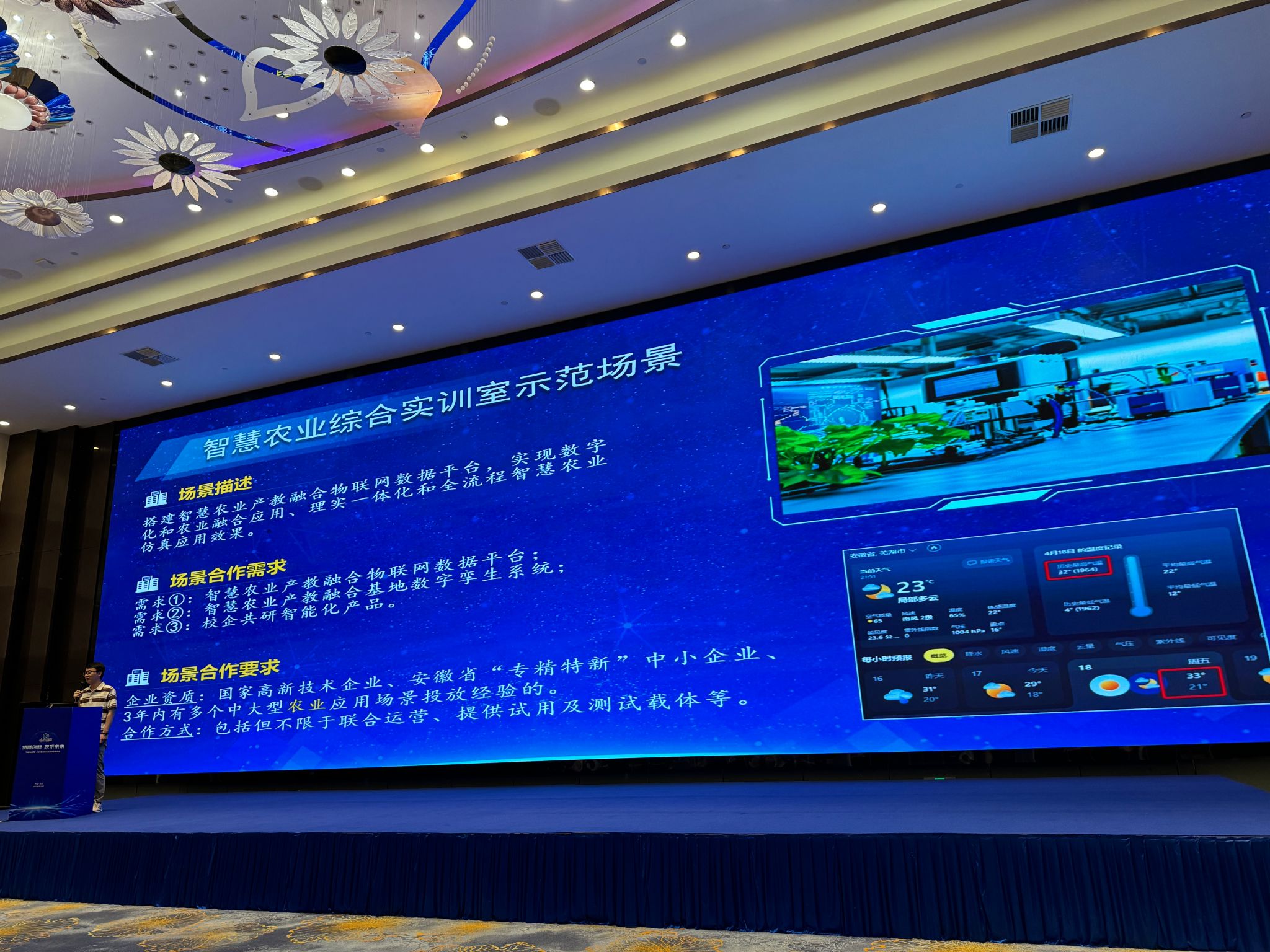 中国无人化农业行业产教融合共同体技术中心平台建设项目作为代表场景上台推介。园林园艺学院许辉博士从共同体建设项目成果、规划愿景和智慧农业综合实训室场景需求等方面做了详细介绍。
