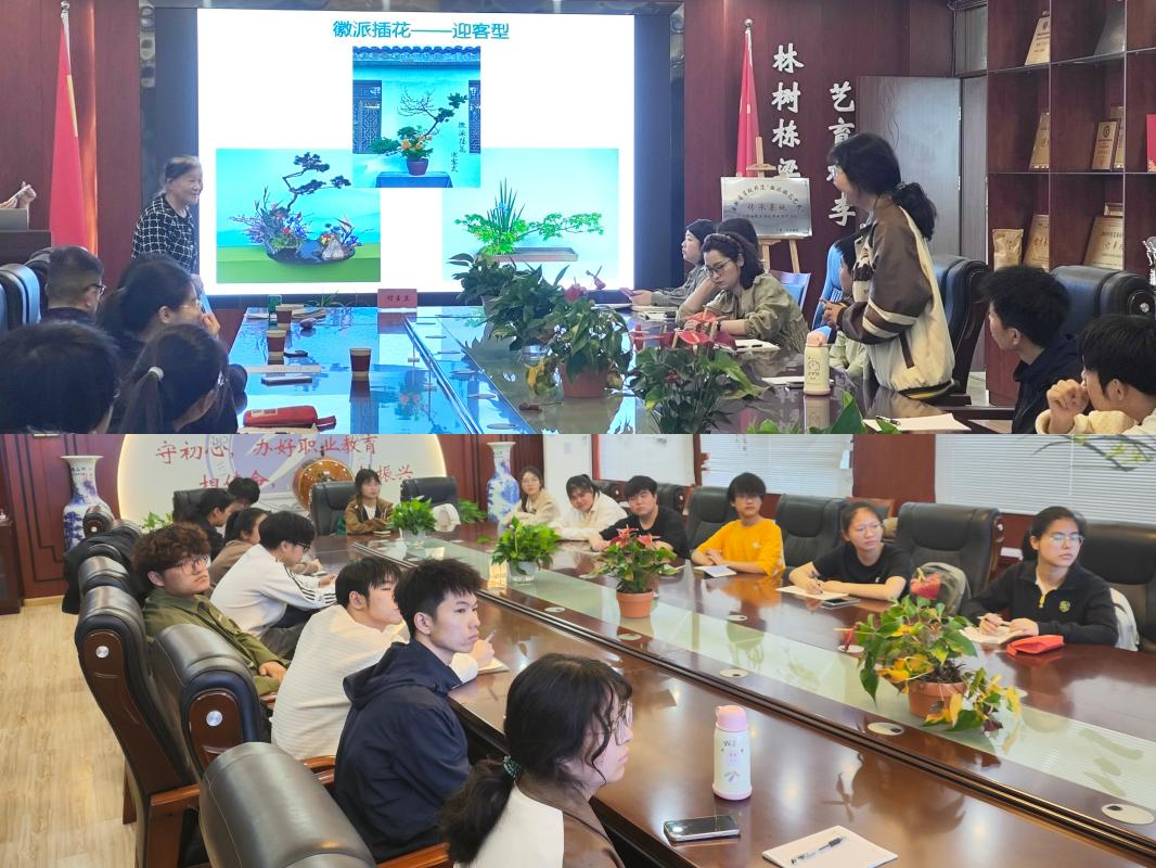 授牌仪式后,付玉兰教授开展徽派插花艺术专题讲座。她从徽派插花的构成要素切入,结合黄山松的自然形态,解析徽派插花“师法自然、以花寄情” 的艺术内核。付教授边讲解徽派插花的造型风格边展示插花案例。讲座现场设置了互动环节,学生积极回答付教授问题,对徽派插花产生了浓厚的兴趣。