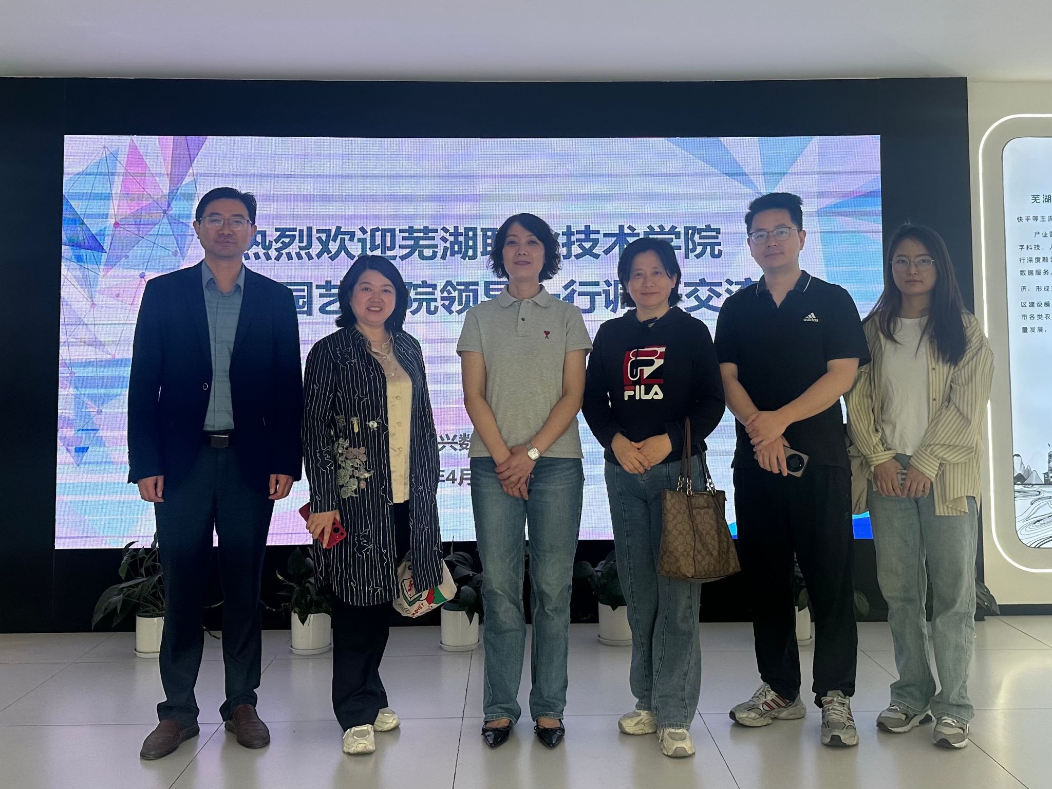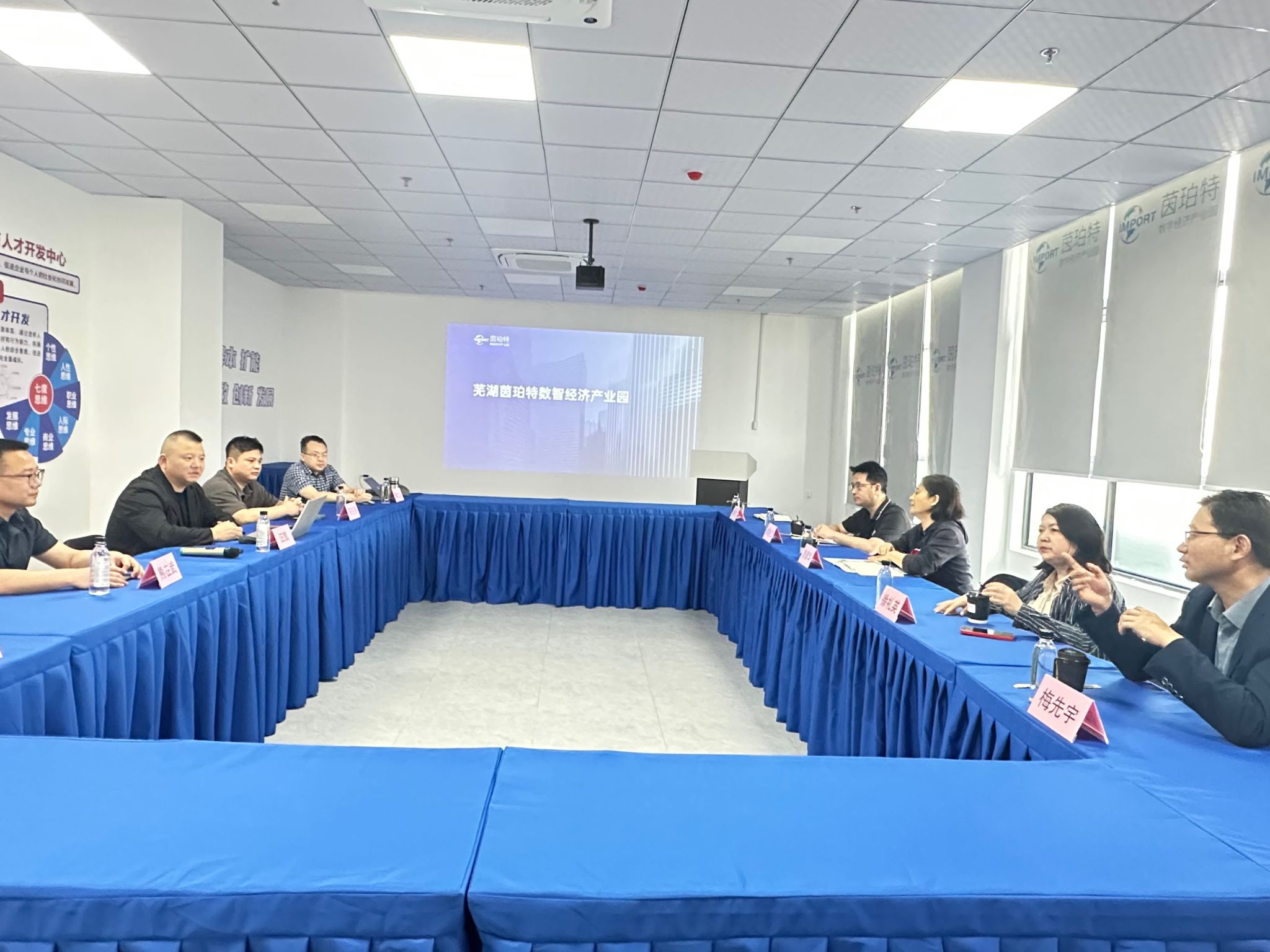 随后,学院一行前往芜湖茵珀特数智经济产业园进行考察交流。安徽茵珀特企业孵化有限公司总经理汪凯、安徽三泓水建设有限公司总经理朱锦霖等企业负责人参与接待座谈。座谈会上,汪凯详细介绍了产业园的运营模式、产业布局及对园林园艺、生态建设等领域的技术需求。朱锦霖结合三泓水建设的业务领域,分享了企业在水利工程、生态修复等项目中的实践经验,表达了与学院在技术研发、人才输送等方面的合作意愿。双方围绕校企合作模式、实习就业基地建设、人才联合培养等议题展开深入交流,就共建实习实训基地、开展产学研合作等达成初步共识。