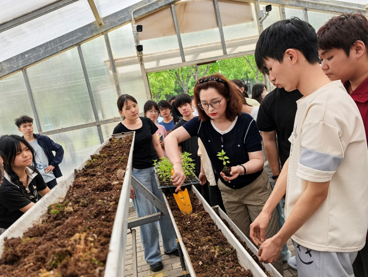 在基地的现代农业示范园内,孟雪老师手持青翠的辣椒苗开展现场教学:“大家注意观察,这种‘苏椒5号'属于早熟品种,株型紧凑适合密植......”从品种选育到水肥配比,从病虫害生物防治到智能滴灌技术应用,专业讲解与实物演示相得益彰。学生们分组领取种植任务后,迅速投入育苗移栽工作。翻土、定距、栽苗、覆膜,年轻的身影在垄间穿梭,两个小时内高效完成1000余株辣椒苗的标准化移栽,同步完成智能滴灌系统的铺设调试。
