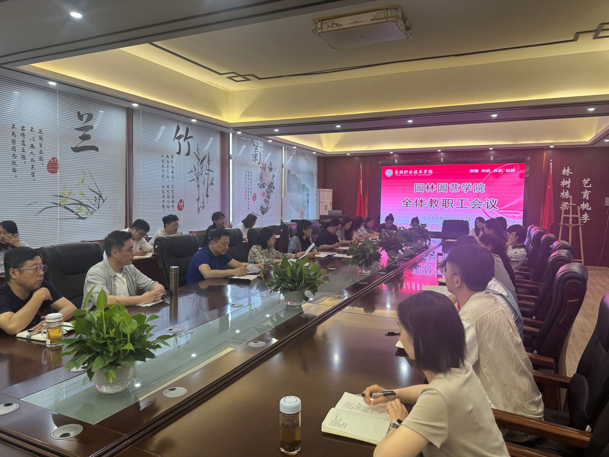 5月14日,园林园艺学院召开全体教师工作会议,学院班子成员及全体教师参会。会议围绕政治理论学习、校园安全稳定、毕业班就业、教学工作检查、教学质量提升、职业教育周活动等重点工作展开,会议由党总支副书记章素华主持。