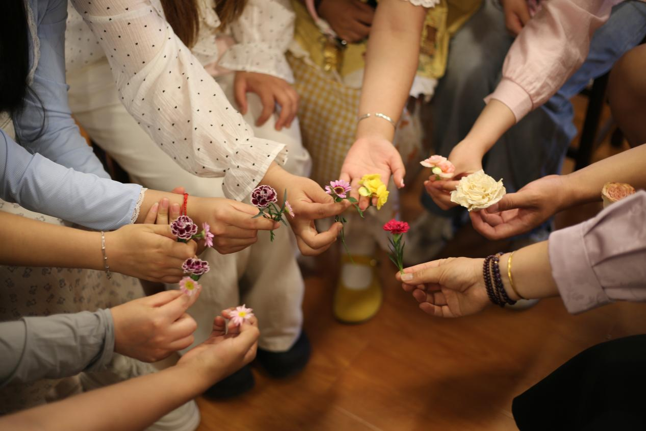 微小花朵手中握,缓缓茶香润心田。本次活动在一场雅致的茶道展示中拉开帷幕,每位同学轻执一支鲜花,围成一圈,吕莹老师以同学们手中的花枝为引,循循善诱,引导学生打开心扉。