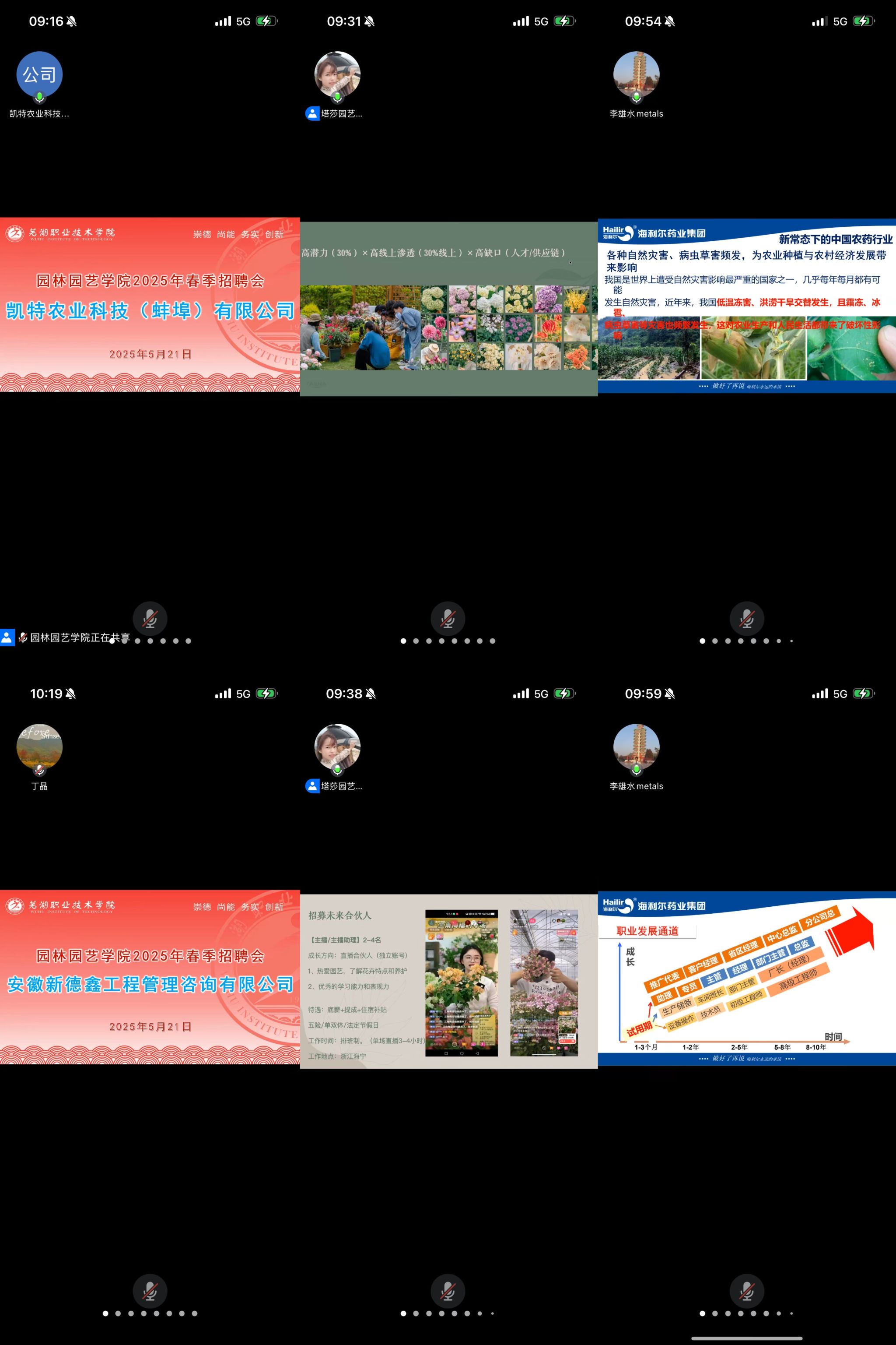 本次线上招聘会邀请了芜湖野树林生物科技股份有限公司、凯特农业科技(蚌埠)有限公司、浙江塔莎园艺有限公司、海利尔药业集团股份有限公司、安徽三泓水建设有限公司、芜湖市绿丰建设集团有限公司等多家优质企业参加,提供就业岗位50余个。招聘会上,企业招聘人员向毕业生就企业文化、人才需求、招聘条件、平台待遇、发展前景等作了说明。在交流互动环节,学生们纷纷根据自身职业规划、发展诉求与岗位偏好,积极主动地添加企业联系方式,双方就岗位细节、职业发展路径等问题展开深入交流,交流氛围良好。