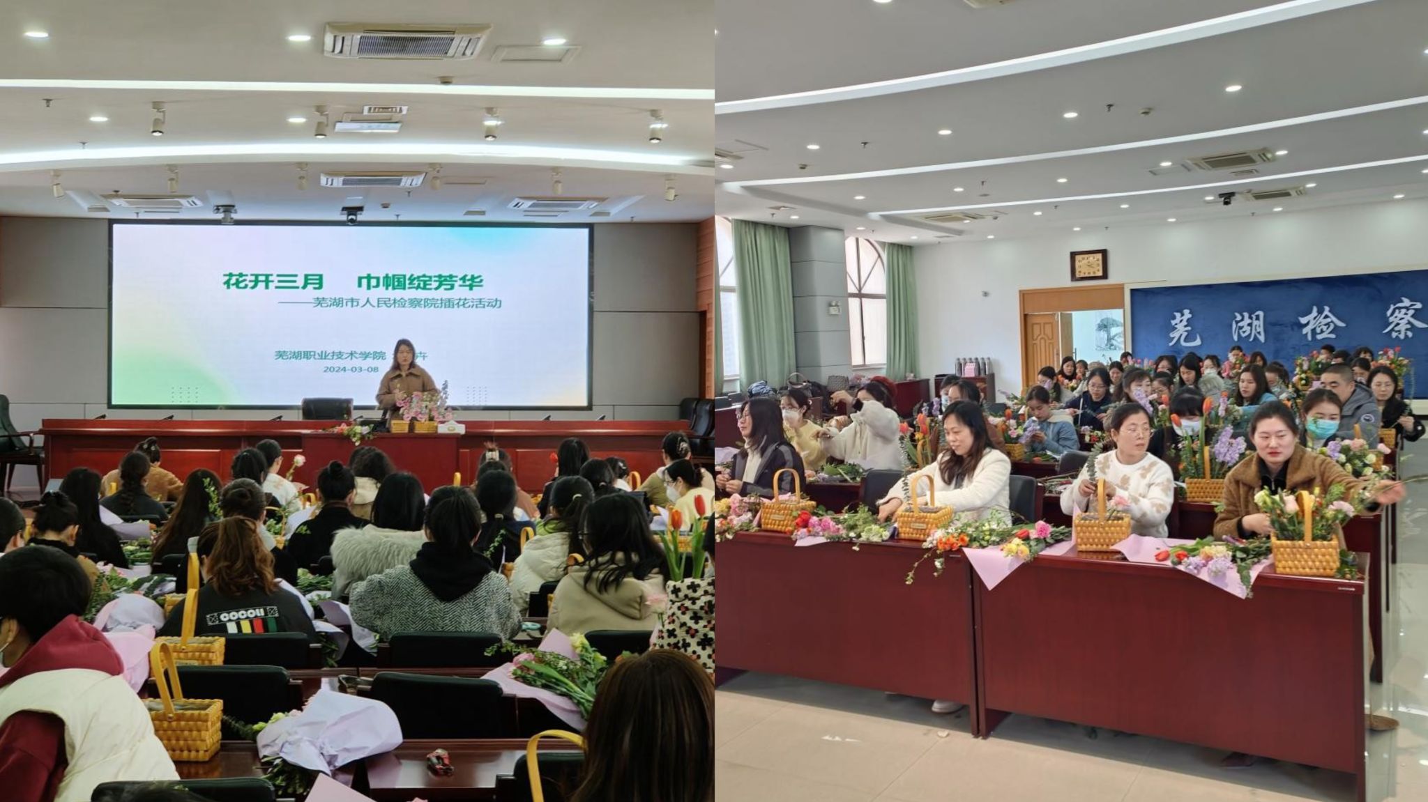 为庆祝“三八”妇女节,致敬女性力量,2024年3月8日,园林园艺学院与芜湖市人民检察院联合举办了以“花开三月,巾帼绽芳华”为主题的插花活动,园林园艺学院伍卉老师受邀参加。
