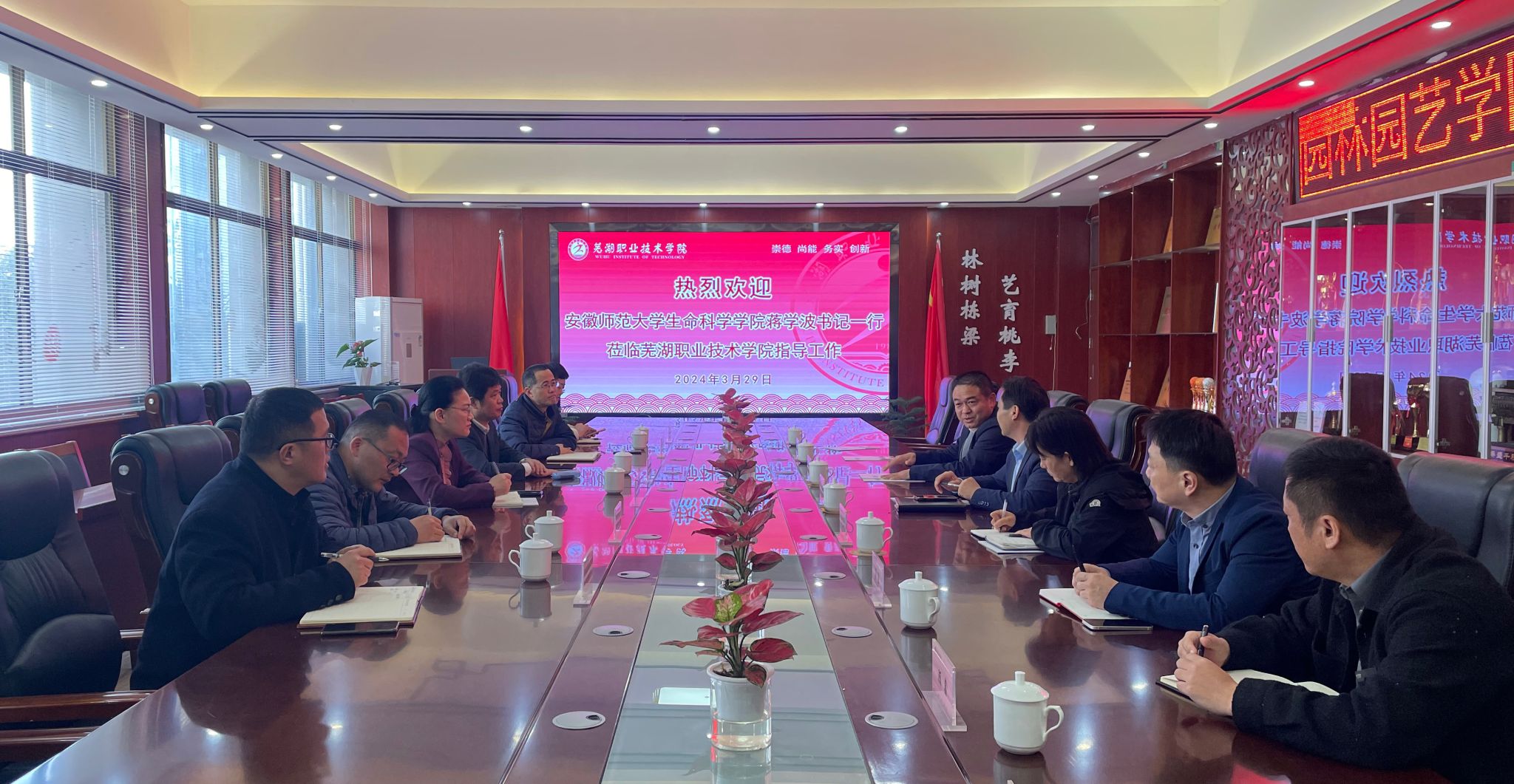 2024年3月29日,安徽师范大学生命科学学院书记蒋学波、院长朱国萍一行六人莅临芜湖职业技术学院指导交流。芜湖职业技术学院党委委员、副校长季慕寅、朱志国予以热情接待,园林园艺学院、生物工程学院领导、教研室主任、骨干教师等参加座谈交流。