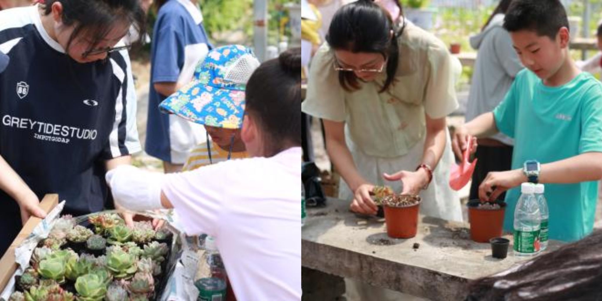 参观过后,在志愿者的指导下,小记者们挑选了自己喜爱的多肉品种及花盆,动手进行种植。他们一边听着志愿者对多肉植物养护技巧的细致耐心讲解,一边跃跃欲试动手种植。看到自己亲手种植的多肉盆栽,每位小记者成就感满满,脸上洋溢着喜悦的笑容。