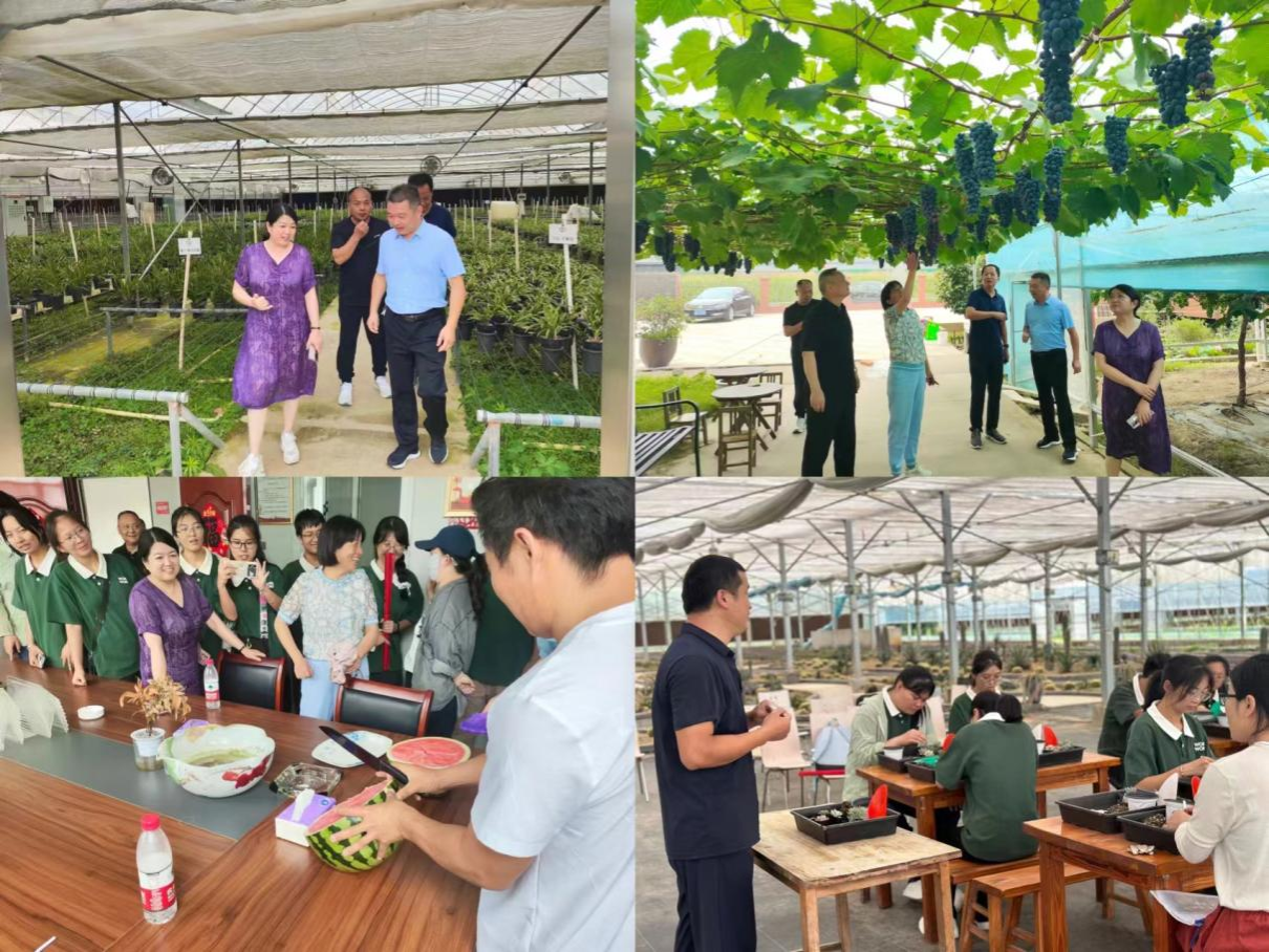师生们第一站来到了庐江县同大镇兰之州兰花种植基地,棚内种植上千兰花品种,师生们了解不同兰花的品种和种植经验;第二站到达清水河鲜提子园,该园是现代特色高效观光采摘园,农家乐和葡萄酒庄的特色园区模式,让同学们印象深刻,同时也为以后走上工作岗位的基层农技推广工作积累经验;师生们来到庐江千万家农业服务有限公司,当地负责人热情招待师生们一起品尝自家大棚里种植的西瓜,高品质的西瓜味道让大家赞不绝口;最后,师生参观了锦州多肉基地和奇迹农场,师生们一同体验移栽多肉的乐趣、了解学习种植多肉的细节,感受乡村振兴的魅力。