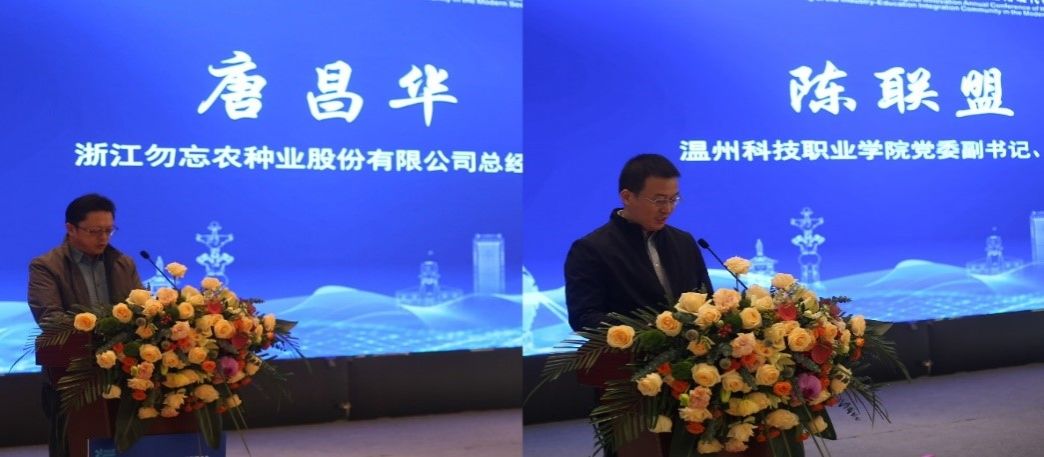 会上还进行了长三角现代种业行业产教融合体成立大会。长三角现代种业行业产教融合体是由浙江勿忘农种业股份有限公司、浙江农林大学、温州科技职业学院、芜湖职业技术学院牵头,大会审议通过了共同体章程,表决通过了共同体理事长单位及副理事长单位名单,理事长、秘书长、副秘书长名单。牵头单位浙江农林大学党委委员、副校长胡祖吉,温州科技职业学院副书记、院长陈联盟等发表讲话,对推进落实“一体两翼”战略任务,努力打造中国种业发展的“职教高地”,形成一个具有区域示范性的“产教布局高度匹配、服务高效对接、支撑现代种业高质量发展”的产教融合共同体样本等提出建议和设想。(文/丁晶 李文全 图/黄千姿 胡凤超 审/章素华)