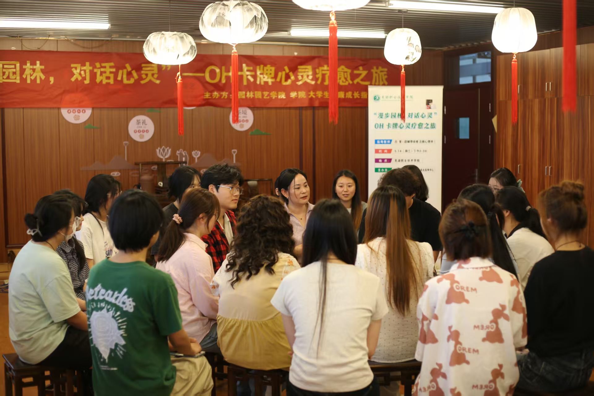 5月14日,园林园艺学院开展525大学生心理健康月系列活动——“漫步园林·对话心灵”OH卡牌心灵疗愈之旅,本次活动由注册心理咨询师吕莹老师带领,吸引来自各个学院的同学参加。
