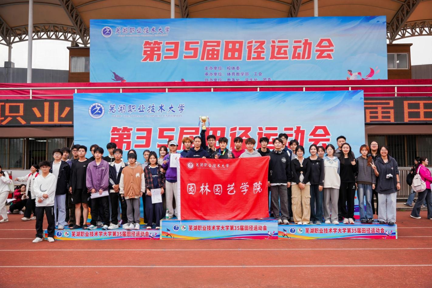 在芜湖职业技术大学第35届运动会上,园林园艺学院的运动健儿们在赛场上团结协作、奋勇拼搏,以坚韧的毅力和出色的表现,荣获团体总分第三名的可喜成绩,同时获得了“优秀组织奖”,展现了园艺学子们昂扬向上的精神风貌。