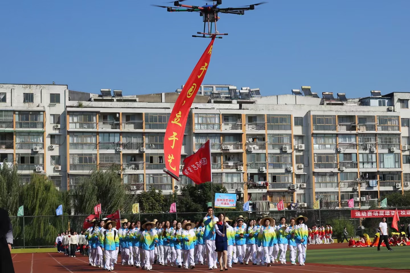开幕式上,园林园艺学院方队在无人机的引领下,怀着“成于园、立于艺”的坚定信念,迈着整齐的步伐,昂首走进会场。