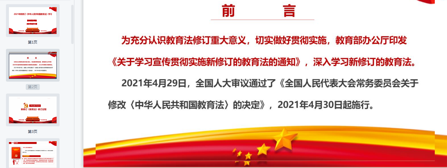 《中华人民共和国教育法(2021修订)》是国家法制建设的体现,修订的五个条款,丰富了教育的指导思想、凸显了教育的重要地位、完善了教育方针、充实了教育内容、健全了“培养什么人、怎样培养人、为谁培养人”的法律规范和制度要求、对构建德智体美劳全面培养的教育体系、推动教育高质量发展意义重大。学院党总支书记杨宁说:“正值全党上下开展党史学习教育,教育法要与党史学习教育结合起来,深入了解加强党对教育事业的领导的历史与现实意义,充分发挥‘党的历史是最生动、最有说服力的教科书’的育人功能,真正做到‘学史明理、学史增信、学史崇德、学史力行’,使各类课程与思想政治理论课同向同行,形成协同育人效应,要从党和国家事业发展全局的高度,坚守为党育人、为国育才,把立德树人融入思想道德教育、文化知识教育、社会实践教育各环节,贯穿基础教育、职业教育、高等教育各领域,体现到学科体系、教学体系、教材体系、管理体系建设各方面,培根铸魂、启智润心。”