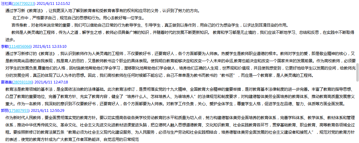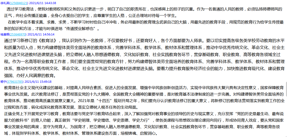 线上交流学习体会中,教师们纷纷表示,通过对新修订教育法学习,深刻领悟到将习近平新时代中国特色社会主义思想纳入教育指导思想是新时代教育发展的必然要求;深刻认识到在教育教学工作之中要严格规范自己的行为和思想,将新修订的教育法贯彻落实到教育工作的全过程和各方面;深刻领悟到教育法修订对全面推进依法治教的重要意义;教育公平是社会公平的重要基础。同时,深入了解加强党对教育事业领导的历史与现实意义,了解党的教育方针的历史演变,进一步深化教育改革发展,落实立德树人根本任务,结合学校“十四五”规划,推进学院“双高建设”高质量发展。(文、图/章素华、童婷婷 审/杨宁)