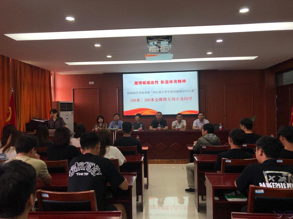 6月4日上午,园林园艺学院在精实楼二楼多功能报告厅举办了“2021年省大学生体育联赛田径比赛”100米、200米金牌得主刘小龙同学表彰大会。参加会议的有校体委副主任、学校体育教学部主任宦集体;校高水平田径俱乐部总教练员、体育教学部老师潘云磊;园林园艺学院党政领导班子,全体辅导员和近百名学生代表。会议由学院党总支副书记章素华主持。